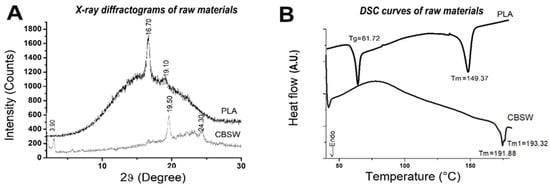 In the XRD diffractogram of the PLA (Figure 4A), more defined diffraction peaks emerge at 2θ = 16.70° and at 2θ = 19.10° over a broad amorphous band, assigned to the crystalline plane (110) and (203), respectively []. The diffractogram of the CBSW sample (Figure 4A) shows peaks at 2θ = 3.09°, 19.5°, 21.20°, 22.02° (002), 23.11° and 24.30°, some of which are characteristic of crystalline polymorphs of cellulose [,]. The cocoa bean from which the powder was obtained is composed of about 60 wt.% water and holocellulose (cellulose, hemicellulose, pectin) and then lignin [] and its XRD diffractogram is very similar to cocoa butter [].
