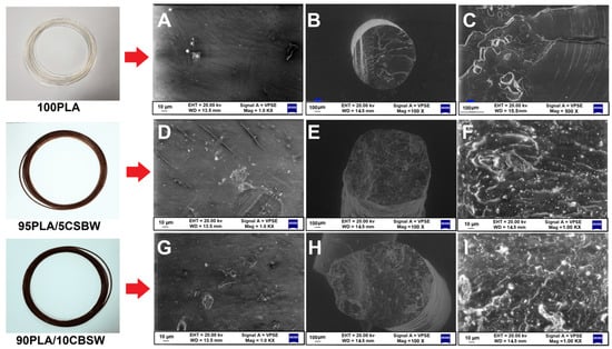 SEM analyses were performed on the external surfaces of the composite filaments to investigate surface roughness and on the cross-section of filaments to verify homogeneity (Figure 5). The surface of the composite filament becomes slightly irregular after the addition of CBSW (Figure 5D–F), and some discontinuity areas are observed (Sample 95PLA/5CBSW). This phenomenon becomes more pronounced with the increase in the amount of filler added to the polymer matrix (Sample 90PLA/10CBSW), where the surface appears completely rough (Figure 5G–I). Furthermore, as shown by the cross-sectional images of the two produced FFF biofilaments, the cocoa particles aggregate in some places and these aggregates are even more visible in the filament containing 10 wt.% CBSW. The phenomenon appears to be attributable not only to a different diameter of the particles in the mixture (PLA approximately 500 µm measured by SEM and CBSW 5 µm to 1 mm diameter measured by SEM), but also to a different chemical nature that creates poor interfacial adhesion. This occurrence is already known in the literature for various PLA-based composites and waste fillers with different polarities and may indicate the possibility in the future of using plasticizer agents that improve the compatibility and adhesiveness of the different substances [].