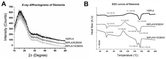 XRD spectra of filaments show only amorphous bands and a remarkable decrease in the intensity of diffraction peaks relative to the raw materials (Figure 6A). However, no major differences are shown between the 100PLA filament and the 95PLA/5CBSW and 90PLA/10CBSW filaments, indicating that the reticular parameters of the PLA crystal structure remained unchanged after coextrusion of the polymer with CBSW. Similar observations were also reported by Tran et al. 2017 for poly(ε-caprolactone) matrix biocomposites []. Therefore, to obtain information on the variation in the thermal properties of composite filaments compared to pure materials, a DSC analysis was performed (Figure 6B). The DSC thermograms of the PLA-based biofilaments or PLA and CBSW-based filaments are shown in Figure 5B. The glass temperatures (Tg) of all materials were measured using the inflection point: the Tg coincides with the point at which the second derivative is equal to zero. The Tg measured for the 100PLA sample was 59.19 °C, a value similar to that reported in the literature [] and slightly lower than that of the starting pellet.