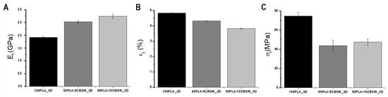 Mechanical properties from tensile tests of 3D samples: (A) Young’s modulus Et (GPa), (B) elongation at break εt (%), (C) maximum strength (MPa).
