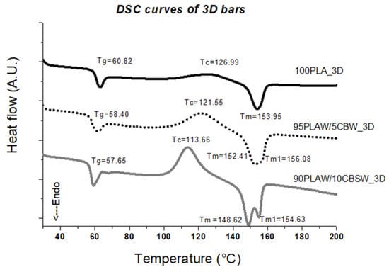 The DSC analysis performed on the FFF printed 3D samples is shown in Figure 8. A decrease in glass transition temperature (Tg) is observed for all 3D samples compared to the pure PLA 3D sample. The crystallization (Tc) and melting temperatures (Tm and Tm1) of the CBSW-based samples also decrease but remain higher than those measured for the corresponding composite filaments, indicating a greater interaction between the polymer chains and the filler and a higher degree of crystallinity after the printing process. This also explains the increase in Young’s modulus of the CBSW-based 3D samples described above. There is also always a double melting peak in 3D samples due to the presence of the filler in the polymer matrix, i.e., different phases.