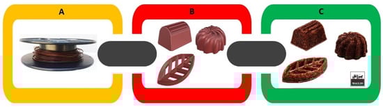 Three-dimensional objects (chocolate shaped objects) were also printed to demonstrate the printability of complex shapes with the recycled filaments. For this purpose, the BQ Hephestos 2 printer (BQ, Barcelona, España) was used with the following printing parameters: extrusion temperature 200 °C, plate temperature 0 °C, printing speed 60 mm/s and infill 20%.