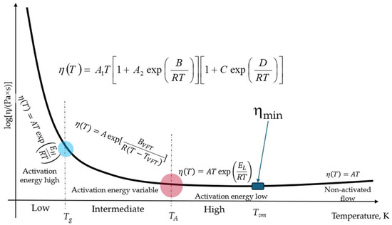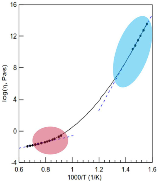 Within the temperature range from Tg to TA, the activation energy of the temperature dependence of liquid viscosity E(T) is, in turn, a function of temperature; thus, viscosity exhibits non-Arrhenius behaviour, typically changing its value for the supercooled melts between 10−2 and 1012 Pa·s (see the vertical axis of Figure 1). It was shown that within this temperature range, configuration entropy (Sc) decreases with decreasing temperatures as glass is increasingly immobilized/vitrified [36]. The most popular equation commonly used to describe the temperature behaviour of viscosity in this range is the Vogel–Fulcher–Tammann (VFT) model, though it completely fails to provide a correct description of viscosity outside the range [3,6,7,9,25,36].