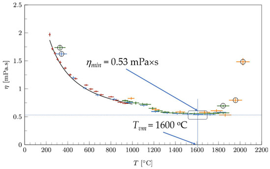 The viscosity of several molten metals was recently measured over a wide temperature range up to 2100 K using an oscillating cup viscometer [24]. The viscosities of both Sn and Pb were successfully measured over the temperature range 506–2135 K for liquid tin and 710–1770 K for liquid lead, providing unpublished data and explicitly revealing the presence of the minimal viscosity of Sn at about 1600 °C (Figure 4).