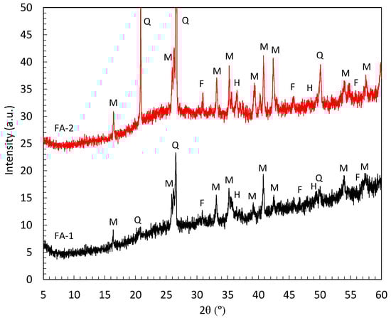 Hard-burnt magnesia (MgO, 97.45%) from Martin Marietta Magnesia Specialties, an American-based company and a leading supplier of high-purity magnesia and dolomitic lime products, was used to prepare the MKPC matrices. Chemical composition of MgO product is summarized in Table 2, which presents high crystalline content of periclase as main crystalline phase, as observed in previous studies [18]. A low-cost KH2PO4 (fertilizer grade of 98%) supplied by Yara (Krista TM) was employed. H3BO3 (>96%) from VWR Chemicals was added as a retarder to delay the acid–base reaction and control the setting time. FA type F from two different sources was introduced as filler material to enhance the fluidity, limit the temperature rise during the setting time, and control the shrinkage risk. XRD pattern of FA shows (see Figure 1) an amorphous hump associated with the vitreous structure, together with the presence of mullite, quartz, and hematite as secondary phases.