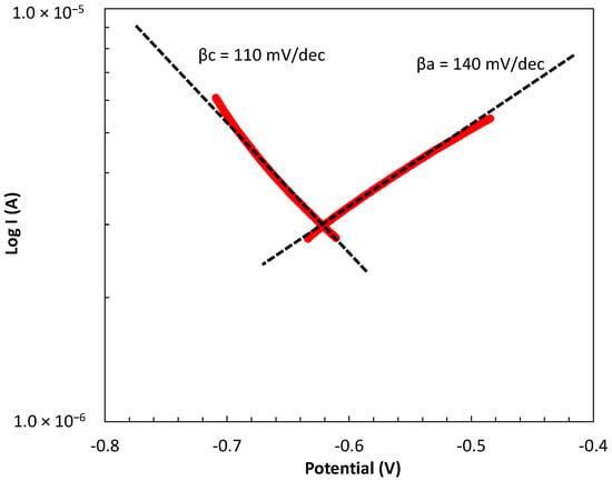 Stern–Geary constant B value of 26 was determined from the slopes of the anodic and cathodic branches in the polarization curves of pure Al (A1050), embedded in 1M MKPC mortar system for 90 days under 100%RH curing, according to Equation (8) [30]: