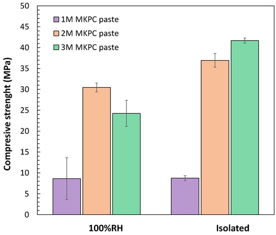 To understand the effect of the M/P ratio and the moisture content on the MKPC physical stability, Figure 3 includes the mechanical strength of MKPC cement pastes after 28 days of curing. The standard deviation is also included. Under both types of curing conditions, higher M/P ratios (2 and 3M) develop more than 50% higher compressive strengths (1M: 8.6 ± 5, 2M: 35 ± 1.6 and 3M: 40 ± 0.6 MPa). The reason for this behaviour has been attributed to the pore structure evolution of the matrix during curing and to the amount of unreacted components, such as MgO, that can contribute to the densification of the matrix and to the nucleation and precipitation of reacted products. Wu et al. [38] and Wang et al. [39] suggest that at higher M/P ratios, a denser microstructure, due to the coexistence and micromorphology of the main reaction products, is generated. Wang et al. [39] suggest that at higher M/P ratios during curing time, the synthesized K-struvite crystals are fully developed, and the crystal growth is more complete, which makes the cement grains well-interconnected and form denser reinforced microstructure. On the other hand, apparently, the moisture content during curing has shown no effect with the 1M M/P ratio, while a certain increase in isolated curing for 2 and 3M was observed. The greater dispersion found with 1M at 100%RH is probably a consequence of the greater instability of this matrix that generates excess phosphates in the matrix favoured by the high moisture content in the pores, as will be discussed later in the paper.