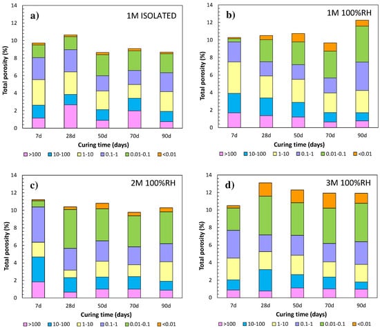 The relationship between the total porosities and the pore size distribution using different M/P ratios is shown in Figure 4b–d for 1, 2, and 3M curing under 100%RH. A general trend of increase in total porosity during curing occurs with the increase in M/P ratio, with 10.0 ± 1% in 1M, 10.5 ± 0.5% in 2M, and 12.0 ± 0.9% in 3M being detected. However, these total porosities do not fit well with the higher compressive strengths at a higher M/P ratio (see Figure 3). To analyse the effect of total porosity in mechanical strength development, the pore size distribution was considered, highlighted in Figure 4 as the following pore ranges: >100, 10–100, 1–10, 0.01–0.1, and <0.01 µm. The first to notice is the increase in capillary pores of size < 0.1 µm with higher M/P ratios (1M: 3.2 ± 1.6%, 2M: 3.6 ± 1.5%, and 3M: 5.2 ± 1.3%), as also observed by [41,42,43]. Some authors [44] have detected a relationship between the decrease in porosity and the increase in compressive strengths as the M/P ratio increases from 4 to 12.