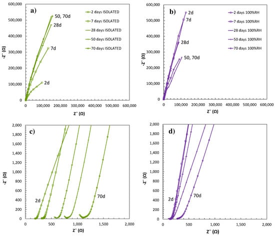 Synergy with the dielectric properties and pore network can also be found, as evaluated with EIS, to provide more information about the MKPC matrix at the microstructural level. Figure 5a,b show the 1M M/P EIS response under isolated and 100%RH at a time interval of up to 70 days of curing. As reported in the literature [45,46,47,48,49], the high-frequency domain in an EIS diagram is attributed to the properties of the cement matrix that can be explained in terms of the pore network: solid phase, disconnected pores, and the electrical resistance of the pore network in terms of the continuously connected pores. Zoomed areas of the Nyquist diagram are represented in Figure 5c,d, which correspond to the high-frequency domain up to 105 Hz for both curing conditions. The inflection point close to the real impedance (Z’) axis has been used to determine the electrical resistance evolution with matrix maturity. Under isolated conditions (see Figure 5c), the matrix electrical resistance increases over time with a shift towards lower frequencies in the inflection point of the high-frequency domain, as also detected in Poras et al. [50]. This is attributed to the acid–base reaction progression with pore water consumption. Contrary, under 100%RH (see Figure 5d), only a slight shift in the high-frequency domain of the Nyquist diagram is observed at the end of the test without a significant increase in the mortar electrical resistance over time. This aspect has been associated with a better electrical conductivity response. Different EIS capacitive response in terms of electrochemical behaviour related to the diameter of the Nyquist semicircle is also detected at low and intermediate frequencies over time for both conditions, related to the connectivity of the pore network of the bulk matrix. A dependence of the apparent dielectric constant on the pore network was also suggested by Cabeza et al. [48], associated with the diameter of the Nyquist semicircle. Under 100%RH, a decrease in the diameter of the semicircle associated with a decrease in the dielectric constant was detected (see Figure 5b), with lower capacitive over time being related to a good pore network in the matrix. On the other hand, an increase in the diameter of the semicircle related to an increase in the capacitive matrix behaviour was observed for the isolated condition (see Figure 5a), giving poor connectivity in the pore network.
