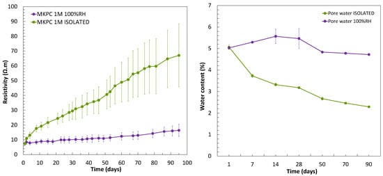 Physical stability of MKPC matrices in terms of acid–base reaction progress with the time of curing was analysed through the changes in the electrical resistivity (ρ) calculated with the R data from EIS and the (Equations (5) and (6)) and pore water content. As observed in Figure 6 (left subfigure), average resistivity of 19.2 ± 2.7 Ω·m after 7 days and 67.1 ± 21.3 Ω·m after 90 days was measured under isolated curing. Previous studies by the authors [18] suggested electrical resistivity values of 15 Ω·m after 7 days for 1M MKPC mortars in isolated curing. The significant increase in ρ in isolated curing is related to a progressive decrease in the water content in the pores, as illustrated in Figure 6 (right subfigure), which is consumed in the progress of acid–base reaction. The initial water content of 5.1 ± 0.1% by g in the sample (bgs) to final values of 2.3 ± 0.05% (bgs) was determined. The increase in electrical resistivity with curing time in isolated curing could also be explained by a reduction in capillary pores (see Figure 4a) and a decrease in pore connectivity (see Figure 5a) over time, as suggested by Liu et al. [51]. In the case of 100%RH, resistivity values of 8.3 ± 1.5 Ω·m after 7 days were measured, which moderately increased over curing advance to final average ρ values of 16.4 ± 4.1 Ω·m. This short-change of electrical resistivity at 100%RH is a consequence of greater water content in pores, in contrast with isolated media (see Figure 6 (right subfigure)). The initial pore water content of 5.0 ± 0.01 % (bgs) to 4.7 ± 0.01% (bgs) was measured at 100%RH. A slight decrease after 28 days was identified, which could explain the small increase in resistivity values under 100%RH curing. The progression of the acid–base reaction of MgO and KH2PO4 was complete under 100%RH since a constant moisture supply was available by the environment as the reaction advanced and consumed to form more KMgPO4∙6H2O (K-struvite). Electrical resistivity data under high-moisture curing conditions are also reported in the literature [52,53,54], with values in the range of 0 to 2.5 Ω·m for MKPC cement pastes and pore solutions.