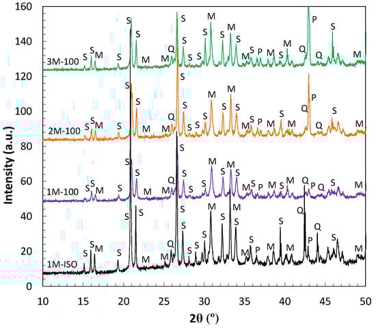 The chemical microstructure of MKPC matrixes can be modified by the M/P ratio and the moisture content. The type of solid phases, the amount of reacted and unreacted products, and the pore solution evolution with curing are affected. Figure 7 and Figure 8 include the crystalline phases determined by XRD. Figure 7 considers the effect of the M/P ratio and moisture on the X-ray diffraction patterns. MKPC mortars at 1, 2, and 3M M/P ratios after 28 days at 100%RH curing and 1M MKPC mortar at isolated curing were used. K-struvite was detected as the main mineral phase for all systems. Diffraction reflections corresponding to quartz and mullite, coming from the FA and quart corresponding to the sand used to prepare the mortar, were also identified. As expected, at higher M/P ratios (2 and 3M), more residual periclase was detected due to more MgO and less phosphate used to prepare the different MKPC formulations (see Table 3). The coexistence of periclase and K-struvite could densify the matrix and nucleate the progressive precipitation of reacted phases in MKPC cement matrices that would contribute to the strength development, as observed in Figure 3. Also, the increase in capillary pores over time (see Figure 4) may indicate the progressive formation and nucleation of K-struvite, densifying the matrix, as suggested by Ding et al. [40]. In 1M MKPC matrices, no significant differences exist between both curing conditions. With 100%RH, the MKPC acid–base reaction is expected to be favoured, and the main reflections of K-struvite with lower residual periclase were detected at 20.99° and 42.92°, respectively, as also observed in previous studies by the authors [18]. However, the formation of other phosphate amorphous phases cannot be discarded and favoured due to the high amount of KH2PO4 in the MKPC initial formulation (see Table 3) and enough water to maintain the progress of the reaction. Under isolated curing, K-struvite and more defined reflections of non-reacted MgO were detected at 20.83° and 42.92°, respectively, probably because the water amount for the progress reaction is not enough. Other differences observed, as shown in Figure 7, were related to the intensity of the main reflection of K-struvite with 147 a.u. and 27.5 a.u. for isolated curing and 100%RH, respectively. A slight shift of 0.16° in the main reflection position of the K-struvite was observed under 100%RH, justified by a decrease in the interplanar distances by the compression of its lattice structure, as recently suggested by Li et al. [55].