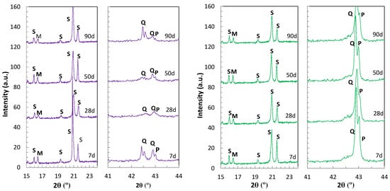 The influence of the M/P ratio in the ageing of MKPC matrices was analysed in the XRD patterns for 1 and 3M M/P mortars shown in Figure 8 (till 90 days at 100%RH). Quartz and mullite, components from the FA, and sand were also identified. Figure 8 (left subfigure) shows that for 1M M/P ratio, periclase diffraction peaks are significantly reduced after 28 days of curing, indicating that most of the MgO has reacted with phosphates to form K-struvite. This is not the case with samples prepared with a 3M M/P ratio, as shown in Figure 8 (right subfigure), where intense diffraction reflections of residual periclase are identified at all curing ages. In this context, the advance of matrix ageing has been attributed to the advance of MgO and KH2PO4 acid–base reaction and the formation of K-struvite. The coexistence of both MgO and K-struvite contributes to the densification of the microstructure, with a more refined pore structure and higher compressive strength with the increase in the M/P ratio, as also suggested by [39,40]. However, the precipitation of brucite has been observed in every system, even in the systems with high periclase content, after 90 days at 100%RH.