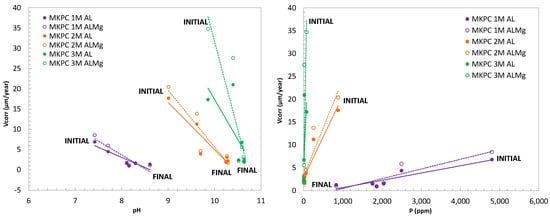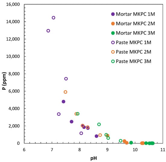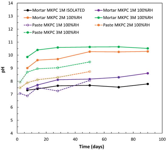 The pH of the liquid pore media was analysed to better understand the reaction mechanism of MgO/KH2PO4 to form the cementitious main product, K-struvite, which also affects the electrochemical stability of aluminium immobilized in the matrix. The effect of the M/P ratio (1, 2, and 3M) and the moisture content during curing (100%RH and in isolated curing) on the pore pH was determined in cement pastes and mortars, as shown in Figure 9. There was a clear increase in the pore pH values with the increase in the M/P ratio (observed in both pastes and mortars). Some authors have also predicted an increase in the pH with an increase in the M/P ratio, verified using a thermodynamic database and thermodynamic modelling [56] with pH values up to 12.1 for an M/P ratio > 1, and in [57] with a pore pH of around 10.5 for an M/P ratio of 4. Differences in pH were also found between mortars and cement paste for the same M/P ratio, the latter showing lower pH values. Mortars are initially prepared with higher w/s ratios, and these can have an impact on the solubility of the different phases and the release of the ions to the pore solution. The most plausible consequence could be associated with the equilibria with the other pore ions in the pores, such as, for instance, phosphates, which will be analysed later. An increase in the pH evolution with curing was detected for all M/P ratios and the two moisture content studied. A stabilization of pH was found after 28 days of curing, with values of 8.7 and 9.5 in cement pastes and 10.3 and 10.5 in mortars for 2M and 3M M/P ratios, respectively. Near-neutral pH values were observed at lower M/P ratios of 1M for both curing conditions. Final pH values of 8.6 and 8.1 in mortar and pastes, respectively, were identified for 1M under 100%RH, with a slight evolution over time. The isolated curing gives a lower pH of around 7.8 after stabilization. The slight difference between the two curing conditions is explained by the differences in the pore ion content related to the progress of the acid–base reaction.