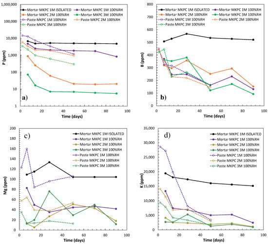 The MKPC microstructural changes in the function of the M/P ratio and curing conditions are in chemical equilibria with the evolution of pore ion content, as can be deduced from Figure 10a (phosphates, P), Figure 10b (borates, B), Figure 10c (magnesium, Mg), and Figure 10d (potassium, K). Understanding the effect of the M/P ratio at 100%RH, higher phosphate content in early stages is observed at a lower M/P ratio (see Figure 10a). In addition to that, the phosphate content is higher in cement paste than in mortar, which could explain the lower pH values observed in Figure 9. This would support the fact that phosphates are also pore pH controllers. As described in previous studies [18], at pH 7, the predominant form of phosphate is H2PO4 (50%) and HPO42− (50%), which moves to 100% HPO42− with higher pH [58]. In Figure 10a, a significant decrease in P occurs over time in all systems, associated with the progress of acid–base reaction of MgO and KH2PO4. K-struvite is formed as the main product, as observed in the XRD patterns (see Figure 7), corroborated by a decrease in K ions in the pore solution with time (see Figure 10d). In the case of 1M, almost all MgO reacts and soluble phosphate remains free in the pore solution in a higher proportion than in 2 and 3M. Figure 10c also shows the Mg2+ concentrations over time, and low contents are measured in general in the pore solution, below 80 ppm for mortar 1M and cement paste and mortar 2 and 3M. At a lower M/P ratio, some higher ion content is detected for cement paste in 100%RH and in isolated curing. Borates are also identified in Figure 10b, decreasing over time in all M/P ratios, however, no effect on the M/P ratio can be clearly derived. As suggested by Lahalle et al. [59] and Zheng et al. [60], borates are not precipitated in the crystal form as a reaction product of hardened cement matrix, at least not in crystalline form—as XRD patterns show (see Figure 7)—but remains in the pore solution. As reported by Lahalle et al. [61], the decrease in B ions in the pore solution over time could be explained by adsorption of boric acid or the precipitation of a coating layer of B(OH)4 on the surface of MgO that could slow down its dissolution.