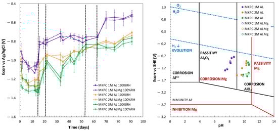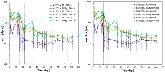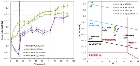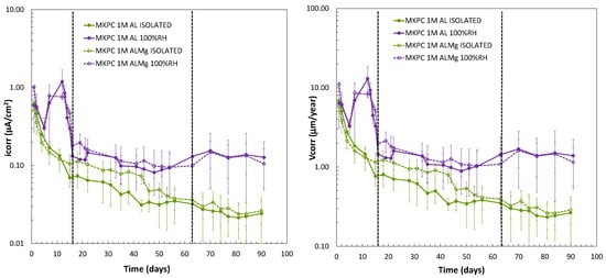It is well established that the moisture content of concrete is a significant parameter that controls the rebar corrosion phenomena [62,63]. In the present study, the effect of two levels of moisture content in the pores of MKPC cementitious matrices (100%RH and isolated curing) was evaluated to characterize the corrosion behaviour of pure Al (A1050) and AlMg 3.5% (AA5754) alloy in 1M MKPC mortars. The monitoring of corrosion potential (Ecorr) versus time is observed in Figure 11 (left subfigure). A continuous growth to more anodic values is observed for 1M MKPC mortars under isolated conditions, compared with 100%RH curing. Under isolated conditions, the acid–base reaction is not complete and leads to a lower pore pH and a higher number of phosphate ions, both effects possibly contributing to the passivation process and the formation of the passive layer, as also mentioned in [64,65]. In the first days of interaction with the matrix at isolated curing, the AlMg alloy (AA5754) shows more anodic Ecorr values than pure Al (A1050. But this situation changes with curing time, probably due to the higher number of phosphate ions at early stages, which could be better adsorbed on the surface of the AlMg alloy (AA5754), giving a protective effect in the corrosion response. In addition to that, the pore pH may also have a significant role, as suggested by Wang et al. [20].