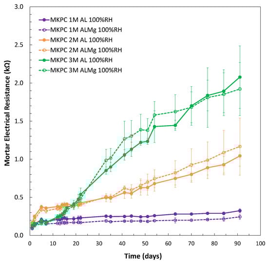 Electrochemical impedance spectroscopy (EIS) was used for the characterization of the electrical resistivity and dielectric properties of the MKPC matrices. Prismatic 1M MKPC mortar samples of 3 × 3 × 3 cm dimensions were measured over 90 days under two different moisture content: in a chamber at 100%RH and isolated in sealed plastic containers (see Table 4, point c). Two stainless steel meshes of 3 × 3 cm each were embedded in the mortars at a distance of 1.5 cm. Measurements were obtained using a sine wave AC voltage of 32 mV r.m.s at a frequency of 10 kHz using an Autolab AUT84750 potenciostat/galvanostat by Metrohm Hispania (Madrid, Spain), using an excitation potential of 10 mV in a frequency range from 105 Hz to 0.01 Hz. The evolution of the electrical resistance was determined using the inflection point at different frequencies, and the electrical resistivity was calculated following Equations (5) and (6):