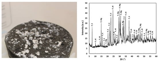 According to Equation (4), magnesium potassium phosphate hexahydrate (KMgPO4·6H2O), also known as K-struvite, is the MKPC stoichiometric reaction product. This chemical reaction involves the dissolution of MgO, producing Mg2+ and OH ions, and then the interaction with KH2PO4 (PO43− and K+ ions), resulting in the precipitation of K-struvite. These reactions involve a high exothermic process, and the incorporation of inorganic additions (e.g., FA, metakaolin or pumice) can contribute to decreasing the total heat and improve the chemical and mechanical properties in a more controlled thermal environment [14]. Due to the rapid acidic–basic reaction, a chemical retarder (e.g., orthoboric acid (H3BO3)) is usually introduced to delay the kinetics of the reaction and control the setting time [15]. MKPC binders with a 1M magnesia-to-phosphate ratio (M/P ratio) have potential advantageous properties with respect to Portland cementitious matrices, such as their lower pH, rapid strength development, resistance to high-temperature environments, low permeability, and excellent corrosion resistance for Al immobilization [16].
