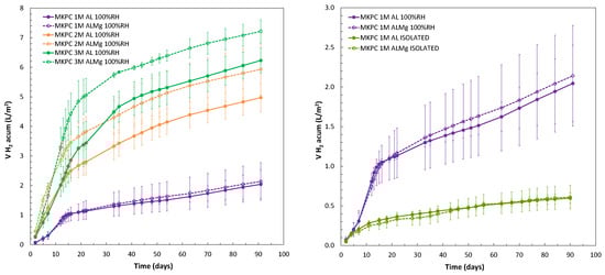Table 9. Accumulated H2 release for pure Al (A1050) and AlMg alloys (AA5754) over 90 days at the 1, 2, and 3M M/P ratios under 100%RH and isolated in plastic containers (endogenous curing).