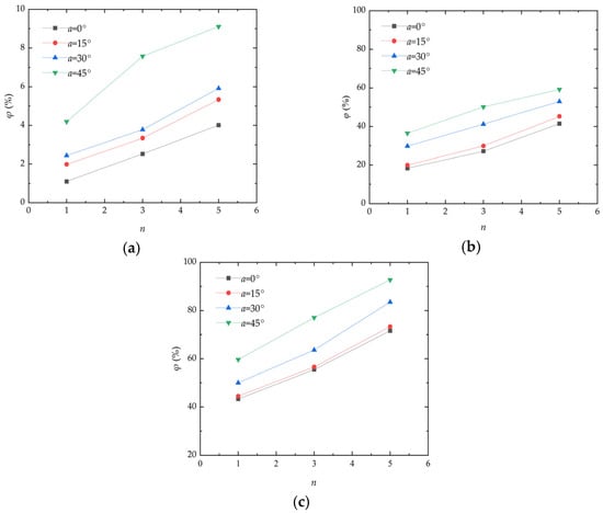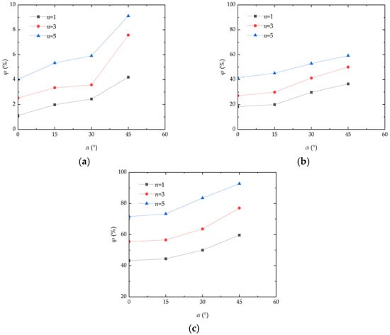 Deflation angle has a significant effect on the mass loss rate of aeolian sand. Figure 5 presents the curve of the mass loss rate variation in aeolian sand with the deflation angle. As can be seen from the figure, the mass loss rate of aeolian sand increases with the increase in the deflation angle under different wind velocities. The mass loss rate of aeolian sand also increases with the increasing number of wind erosion cycles. When the wind velocity and number of wind erosion cycles are constant and the deflation angle increases from 0° to 45°, the mass loss rate of aeolian sand shows a stepwise upward trend. When the wind velocity is 13 m/s and the number of wind erosion cycles is one, the mass loss rate of aeolian sand increases from 43.28% to 44.46%, it then increases from 44.46% to 49.99%, and it finally increases from 49.99% to 59.66%. The fundamental reason for this is that with the continuous increase in the deflation angle, the wind erosion experienced by the samples increase and the corresponding TFV decreases, so that sand particles are blown away by wind more easily. As a result, the mass loss rate of aeolian sand changes steadily when the deflation angle increases from 0° to 30°, but it changes sharply when the deflation angle increases from 30° to 45°. Low wind velocity cannot destroy the solid surface of aeolian sand []. When the deflation angle increases, the surface area of wind acting on aeolian sand increases gradually, which will blow the solid sand lumps on the outer surface of aeolian sand away from sand tables, leading to a steady increase in the deflation mass of internal loose sand. Tominaga et al. [] conducted a wind tunnel experiment of sand erosion/deposition around the cube. The conclusion is that as the wind velocity increased, the mass transport rate increased sharply. And, most importantly, considerable erosion occurred at the windward corners of the cube. All these findings can be echoed in this paper.