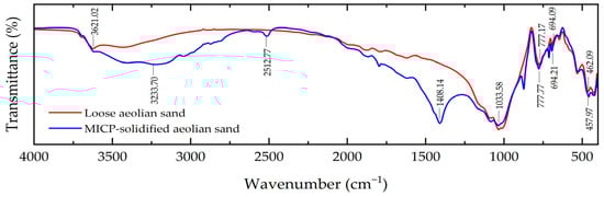 Figure 10 shows the FTIR testing results of both loose aeolian sand and MICP-solidified aeolian sand. As shown in the figure, the absorption peak of the two samples is mainly a narrow peak, and the position and quantity of absorption peaks vary slightly. The peaks at the location of 3621.02 cm−1 are O-H and N-H stretching vibration peaks; the peaks at the locations of 777.17 cm−1, 694.09 cm−1, and 462.09 cm−1 are Si-O symmetric stretching vibration peaks. The peak position at the location of 3233.70 cm−1 is the O-H stretching vibration peak, the peak at the location of 2512.77 cm−1 is the asymmetric vibration peak of , and the absorption peak at the location of 1408.14 cm−1 is the C-O antisymmetric stretching vibration peak of , as well as the characteristic peak of vaterite. The peak at the location of 1033.58 cm−1 is the C-O symmetric stretching vibration peak of , indicating the presence of carbonate. The peaks at the locations of 777.77 cm−1, 694.21 cm−1, and 457.97 cm−1 are Si-O symmetric stretching vibration peaks, and SiO2 is the main component of sand particles, which is consistent with the XRD test results. It can be concluded that the carbonate generated in the process of MICP mineralization is CaCO3.
