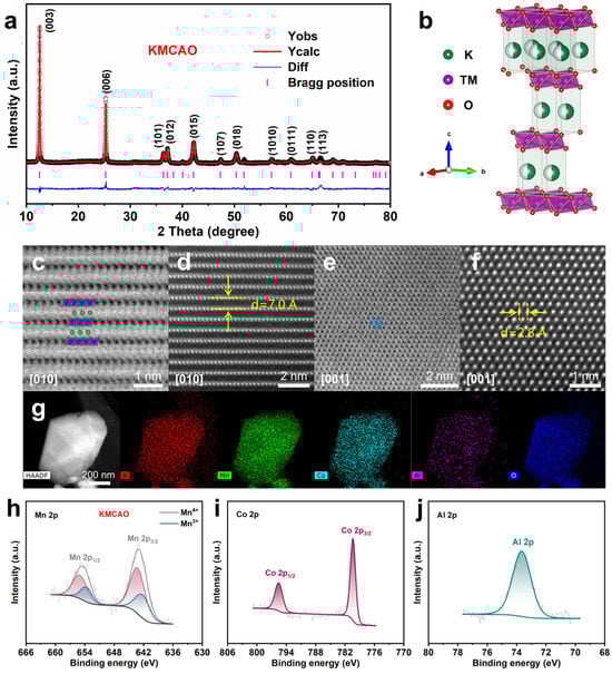 Structure characterizations of the KMCAO and KMO. (a) XRD Rietveld refinement of KMCAO. (b) P3 type structure schematic. (c) ABF-STEM and (d) HAADF-STEM images of KMCAO along the [010] zone axis. (e) ABF-STEM and (f) HAADF-STEM images of KMCAO along the [001] zone axis. (g) HAADF-STEM image of KMCAO and the corresponding EDS mappings for K, Mn, Co, Al and O elements. The XPS spectra of (h) Mn 2p, (i) Co 2p and (j) Al 2p of KMCAO.