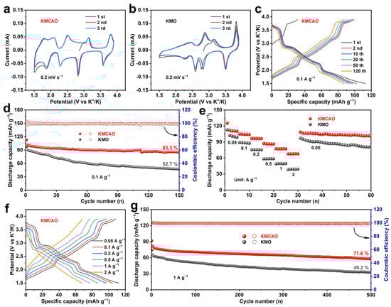 Electrochemical performance of KMCAO and KMO in 1.5~3.9 V (vs. K+/K). CV curves of the first three cycles at 0.2 mV s−1 of (a) KMCAO and (b) KMO. (c) Charge/discharge curves of KMCAO at 0.1 A g−1. (d) Cycling performance at 0.1 A g−1. (e) Rate performance at 0.05, 0.1, 0.2, 0.5, 1 and 2 A g−1. (f) The corresponding charge/discharge curves of KMCAO at different rates. (g) Long-term cycling performance at 1 A g−1.