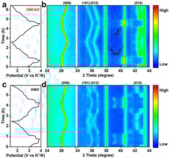 In situ XRD characterization of (a,b) KMCAO and (c,d) KMO at 50 mA g−1 in the range of 1.5~3.9 V.