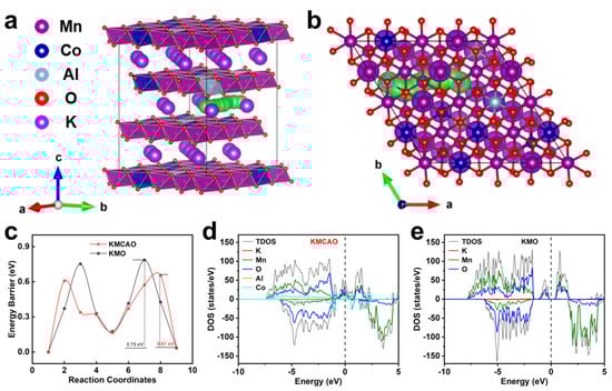 First-principles calculations. Schematic of the KMCAO crystal structure showing the K+ migration pathways (indicated by the green balls) from (a) the side and (b) the top views. (c) The corresponding migration energy barriers in KMCAO and KMO. Density of states of (d) KMCAO and (e) KMO.