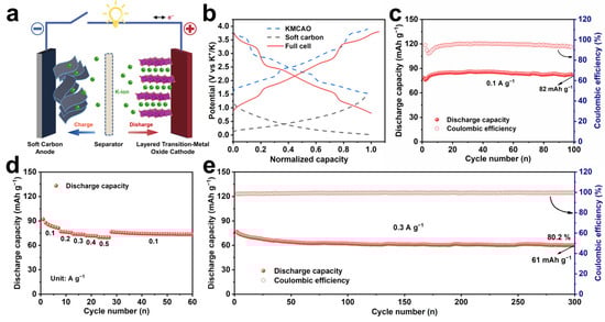 To assess the practical application potential of the KMCAO cathode, performance tests are conducted on a potassium-ion full cell, paired with a soft carbon anode (Figure 5). The structural and morphological characterizations of the soft carbon are shown in Figure S13. And Figure S14 shows its electrochemical performances. Before assembling the full cell, the soft carbon anode was pre-cycled at 0.01~1.5 V (vs. K+/K) to activate the material. The anode/cathode capacity ratio is adjusted to 1.2 to eliminate irreversibility. The configuration and operational mechanism of typical full PIBs are shown in Figure 5a. Figure 5b shows the normalized charge/discharge curves of KMCAO and soft carbon electrodes in half/full PIBs. The full cell maintains a high specific capacity of 82 mAh g−1 after 100 cycles at 0.1 A g−1 (Figure 5c). It also exhibits a good rate performance, with average discharge specific capacities of 85, 76, 73, 71 and 69 mAh g−1 at 0.1, 0.2, 0.3, 0.4 and 0.5 A g−1, respectively (Figure 5d). When tested at 0.3 A g−1, the initial discharge specific capacity of the full cell was 76 mAh g−1 and the initial coulombic efficiency was close to 99%. And the capacity remains at 80.2% after 300 cycles. (Figure 5e). These results highlight that KMCAO cathode has a great deal of potential for practical applications in PIBs.