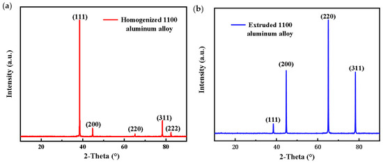 X-ray diffraction pattern of the homogenized (a) and extruded (b) 1100 aluminum alloy.