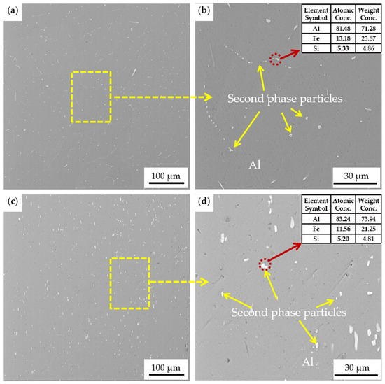 SEM images of the homogenized (a,b) and extruded (c,d) 1100 aluminum alloy; (b) and (d) are the enlarged areas of the yellow boxes in (a,c), respectively.