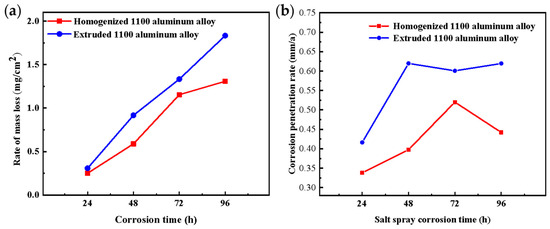 The rate of mass loss (a) and corrosion penetration (b) of the homogenized and extruded 1100 aluminum alloy for different acidic salt spray corrosion times.