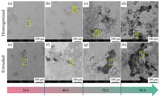 SEM images of the homogenized (a–d) and extruded (e–h) 1100 aluminum alloys for different acidic salt spray corrosion times (24 h, 48 h, 72 h, 96 h).The yellow area marked 1–8 in (a–h) indicates the EDS test area.