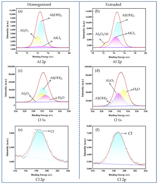XPS spectra of Al 2p, O 1s, and Cl 2p for corrosion products formed on the homogenized (a,c,e) and extruded (b,d,f) 1100 aluminum alloys after 96 h of acidic salt spray corrosion.