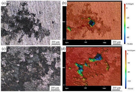 Typical surface morphology of the homogenized (a,b) and extruded (c,d) 1100 aluminum alloy after 96 h of acidic salt spray corrosion using laser scanning confocal microscopy.