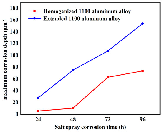 Confocal microscopy was used to measure the depth and area of the corrosion pit of the homogenized and extruded 1100 aluminum alloy. VK-X3000 multi-file analysis software (https://www.keyence.com/products/microscope/laser-microscope/vk-x3000/) was used for data analysis. Figure 8 shows the localized corrosion morphology of the homogenized and extruded 1100 aluminum alloy after 96 h of acidic salt spray corrosion. Figure 8a,b show the optical images and corresponding surface profiles of the homogenized 1100 aluminum alloy; Figure 8c,d are the optical images and corresponding surface profiles of the extruded 1100 aluminum alloy. It can be seen that the corrosion pits of the extruded 1100 aluminum alloy were larger and deeper than those of the homogeneous 1100 aluminum alloy. Figure 9 shows the maximum pitting depth of the homogenized and extruded 1100 aluminum alloy with different salt spray corrosion times. The maximum pitting depth of the homogenized 1100 aluminum alloy was only 5.51 μm after 24 h of acid salt spray corrosion and 10.3 μm after 48 h of corrosion, and the pitting depth increased slowly. Then, the pitting depth increased rapidly, reaching 62.7 μm after 72 h of corrosion, and subsequently slowed down to reach 73.5 μm after 96 h of corrosion. The maximum pitting depth of the extruded 1100 aluminum alloy was initially 27.8 μm after 24 h of corrosion, then gradually increased with the increase in corrosion time. After 96 h of corrosion, the maximum pitting depth reached 154 μm. The results show that the corrosion rate of the extruded 1100 aluminum alloy in acid salt spray was higher than that of the homogeneous 1100 aluminum alloy, which is consistent with the corrosion surface morphology.