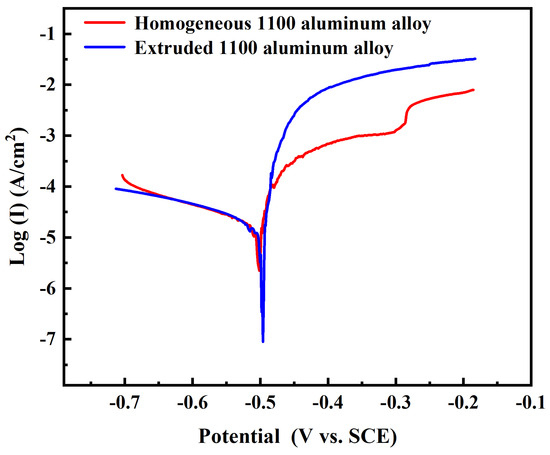 Potentiodynamic polarization curves of homogenized and extruded 1100 aluminum alloy.