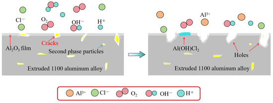 The corrosion mechanism of the extruded 1100 aluminum alloy is shown in Figure 14. The corrosion reaction and corrosion products of the extruded 1100 aluminum alloy in salt spray were similar to those of the homogenized aluminum alloy, but the difference is that the corrosion rate of the extruded 1100 aluminum alloy was faster than that of the homogenized aluminum alloy. The corrosion product layer on the extruded 1100 aluminum alloy surface did not play a protective role, and large corrosion pits were directly formed. This is because the microstructure of the aluminum alloy after extrusion was not uniform, with defects around the second phases. The microstructure defects made it easy for Cl− to erode the aluminum matrix. In addition, due to the potential difference between the second phase and the matrix, a large gap around the second phase particles was easily formed through an electrochemical reaction, increasing the corrosion rate and the depth of the corrosion pit. As a result, the corrosion products fell off or dissolved quickly.