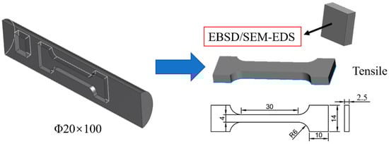 Tensile specimens with a gauge section of 30 mm × 4 mm × 2.5 mm were cut from hot rolled bars along the rolling direction (RD). High-temperature tensile experiments were carried out using an AG-100kNG universal testing machine produced by Shimadzu Company (Kyoto, Japan) at initial strain rates of 1 × 10−3/s, 5 × 10−3/s, and 1 × 10−2/s and temperatures of 550 °C, 650 °C, and 750 °C. Before the experiment, the antioxidant Ti-1 was applied to all test surfaces to minimize or avoid oxidation at high temperatures. During the experiment, the tensile specimens were first heated to the desired temperature and held for 5 min to ensure a fairly uniform temperature distribution throughout the specimen, and then tensile experiments were conducted at a constant strain rate. Three replicate experiments were performed for each state of the specimen. Figure 1 shows the schematic diagram of the experimental samples.