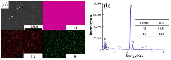 SEM-EDS mapping images of the Ti-2Fe-0.1B alloy. (a) phase composition, (b) energy spectrum analysis.