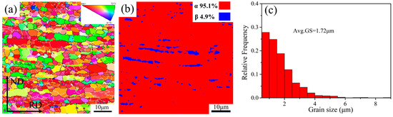 The inverse pole figure (IPF) and grain size distribution of the Ti-2Fe-0.1B alloy measured by EBSD are shown in Figure 3. Different colors of the IPF plots indicate different orientations of individual grains. Red, green, and blue colors indicate that the test surface of the specimen is parallel to the basal plane {0001}, column plane {112}, and conical plane {101}, respectively; the remaining colors are transition planes, which also indicate the transitions between orientation differences [28]. The more similar the colors shown in the IPF diagrams, the smaller the orientation difference between individual grains. On the contrary, the orientation difference is larger. It can be seen that the overall microstructure distribution of the Ti-2Fe-0.1B alloy is mainly dominated by the basal plane, and the orientation difference is large. The phase composition of the α and β phase was calculated and reached 95.1% and 4.9%, respectively, which is well corresponding to the SEM results. At the same time, the average grain size is 1.72 μm, which contains a large number of ultrafine grains with a grain size of less than 1 μm and micrometer grains with a grain size of close to 10 μm. It must be noted that the step size of the EBSD test is too small to accurately recognize the grain size below 0.5 μm, traditional hot working was processed in the present work, and the fraction of the grain size in the range of 0–0.5 μm is rare and could be ignored.