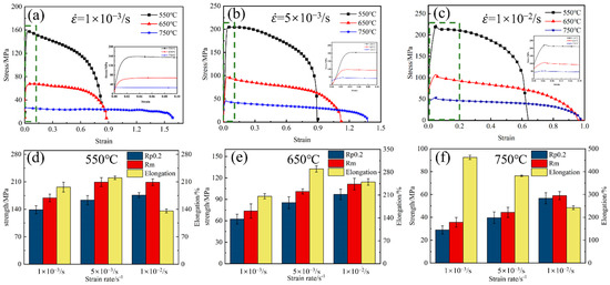 (a–c) The stress–strain curves and the locally enlarged stress–strain curves of the Ti-2Fe-0.1B alloy under different deformation conditions were obtained. (d–f) Yield strength, tensile strength, and elongation.