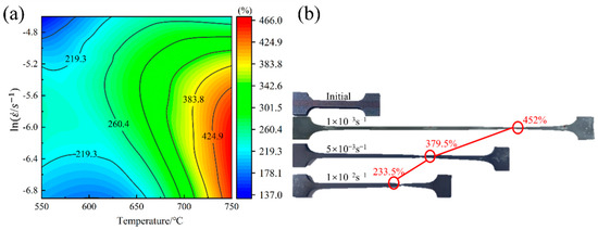 To further analyze the effect of temperature and strain rate on the elongation of the alloy, a contour map illustrating the elongation distribution is presented in Figure 5a. Combined with Figure 4d–f, it can be seen that a higher deformation temperature and lower strain rate led to greater elongation of the alloy. The minimum elongation achieved was 137.5% at a temperature of 550 °C and a high strain rate (1 × 10−2/s). Under other deformation conditions, the maximum elongation exceeded 200%, particularly at 750 °C and a strain rate of 1 × 10−3/s, which attained an impressive maximum elongation of 452%. Figure 5b shows the elongation of the Ti-2Fe-0.1B alloy at 750 °C at different strain rates. The sample exhibits an obvious necking phenomenon at a strain rate of 1 × 10−2/s. However, at strain rates of 5 × 10−3/s and 1 × 10−3/s, the sample demonstrates relatively uniform deformation characteristics with minimal necking phenomenon.