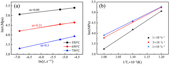 Superplastic deformation of metallic materials is a thermally activated process [31,32,33]. To study the mechanism of material deformation, it is necessary to calculate the values of its deformation activation energy Q and strain rate sensitivity factor m. The strain rate sensitivity index (m) is a critical parameter for characterizing the resistance of superplastic-forming materials to tensile necking. A higher value of m indicates that the material is less susceptible to tensile necking and non-uniform strain, thereby enhancing its formability [34]. When m ≥ 0.3, the material is generally considered to be a superplastic material [16,35,36], and the larger the value of m, the greater the contribution of GBS to superplastic deformation. It is usually defined as the derivative of the true stress–strain rate in the thermostatic true strain double logarithmic plot, denoted as m = ∣T,ε. The lnσ-ln curves at different deformation temperatures at a strain of 0.03 are shown in Figure 6a. It can be seen that the m value is greater than 0.2 when the deformation temperature is 650 °C and 750 °C, and when the deformation temperature is 750 °C, the m value of the alloy is 0.3, which indicates that the material has an excellent superplasticity at 750 °C, which is also consistent with the result of material elongation. It can also be concluded that the deformation mechanism of the material is GBS, accompanied by the movement of dislocations [37,38].