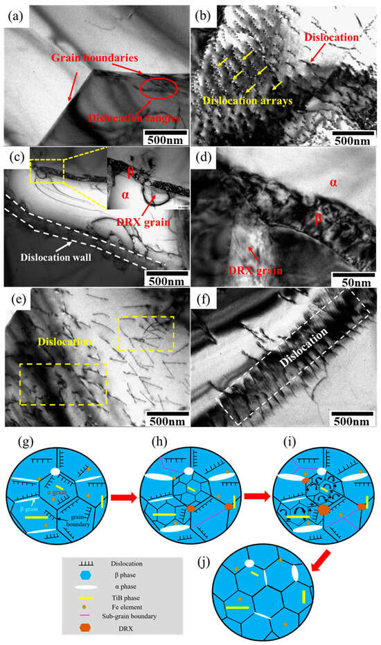 TEM microstructure of the Ti-2Fe-0.1B alloy after superplastic deformation at 750 °C and 1 × 10−3/s: (a,b) dislocation tangles and dislocation arrays; (c,d) dislocation wall and DRX grains; (e) dislocation distribution; (f) TiB phase and SAED pattern of TiB phase; (g–j) microstructure evolution of the alloy during superplastic deformation.
