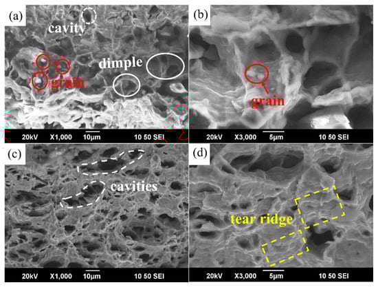 Figure 8 shows the fracture morphology of the Ti-2Fe-0.1B alloy after superplastic deformation. It can be seen from the figure that before the tensile fracture, the sample has a large plastic deformation, and the fracture morphology of the specimen under different deformation conditions contains fracture dimples with a distribution of cavities. In Figure 8a,b, the dimples are large and densely distributed, and there are small grains in the cavity. It seems that the cavity first nucleates on these small particles and then aggregates, grows, and joins under the combined action of GBS and plastic deformation so that a number of cracks are formed on the surface of the specimen. The cracks connect to each other; then, this leads to the fracture of the sample. In Figure 8c,d, there are dimples with plastic fracture characteristics and a large number of tear ridges, which are typical ductile fracture characteristics. The dimples contained in the micromorphology are elongated due to the shear stress of the specimen before fracture.