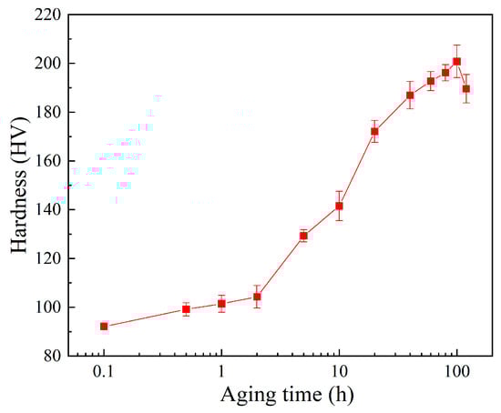 The variation of Vickers hardness with aging time during the initial aging process shown in Figure 2 demonstrates a general hardening–softening trend during the aging process attributed to precipitation hardening mechanisms []. The hardness peaked at 201 HV after aging for 100 h and subsequently began to decrease, and subsequent EPT and AT processes were performed based on the samples in the IA-100h state. This phenomenon is similar to the research findings of Jung et al. [] on a copper-containing carbon steel and Li et al. [] on a FeCu alloy, and it is attributed to the precipitation strengthening effect of CRPs [].
