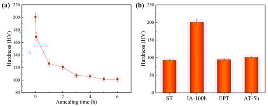 Figure 3a shows the variation of Vickers hardness with annealing time. It is apparent that the hardness of the samples rapidly decreased with the prolonged annealing time and stabilized at approximately 101 HV after annealing for 5 h. Considering practical applications where shorter heat treatment times are typically preferred, a 5 h duration was selected as the processing parameter for the AT group before the re-aging treatment. The Vickers hardness of different states is shown in Figure 3b. It is worth noting that the hardness of samples treated with electropulsing (EPT, 95 HV) and 5 h duration annealing (AT-5h, 101 HV) has recovered to levels close to that of the solution state (ST, 93 HV) from the aged state (IA-100h, 201 HV). Considering the lower hardness of the EPT state and the shorter processing time of EPT, electropulsing exhibits better recovery effectiveness and higher processing efficiency than traditional heat annealing.