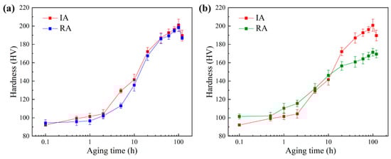 Variation of Vickers hardness with aging time during initial aging (IA) and re-aging (RA): (a) EPT group, (b) AT group.