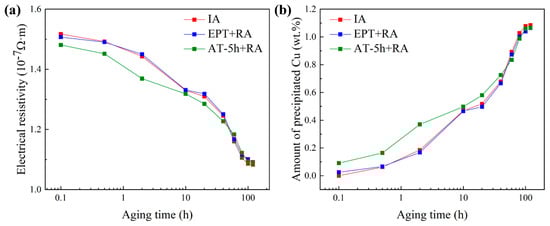 where each alloy element denotes the amount of a solute atom in weight percent, and ρ and ρiron are the electrical resistivity values of the specimen and pure iron at room temperature, respectively. According to Equation (1), a reduction of 40 nΩ·m in electrical resistivity is observed for every weight percent of Cu atoms precipitated from the matrix. The weight fraction of precipitated Cu atoms calculated from electrical resistivity is shown in Figure 5b. For the EPT samples, the precipitation amount and process of Cu atoms during initial aging and re-aging were very similar, with precipitation amounts reaching 1.08 wt.% and 1.04 wt.% at 100 h, respectively. However, for the AT samples, the precipitation process of Cu atoms during re-aging showed a first fast and then slow trend compared to initial aging. Specifically, for the AT-5h state (the origin of the AT-5h + RA curve in Figure 5a), its electrical resistivity was higher than that of the solution state (the origin of the IA curve in Figure 5a), corresponding to a Cu precipitation of 0.091 wt.%, accounting for approximately 10% of the total Cu atoms. This result is consistent with the hardness result, indicating that AT has not entirely eliminated the precipitated CRPs.